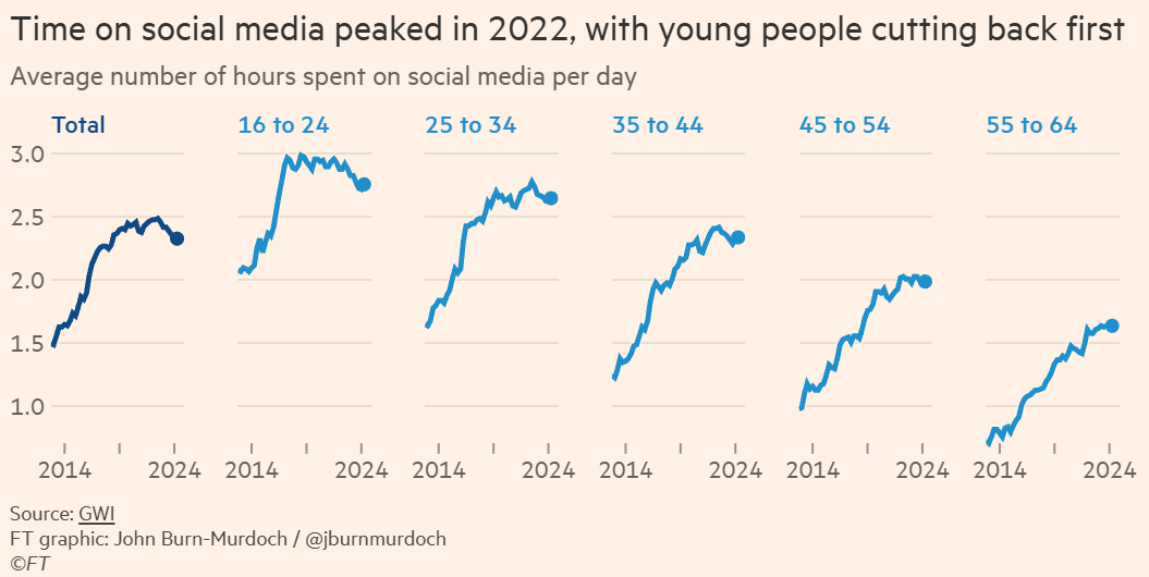 Die Nutzung von Social Media lässt seit drei Jahren nach. Damit würde man intuitiv nicht rechnen. Aber eine Studie von GWI im Auftrag der Financial Times zeigt, dass die Nutzungszeit von Sozialen Medien schon 2022 ihren Höhepunkt hatte.