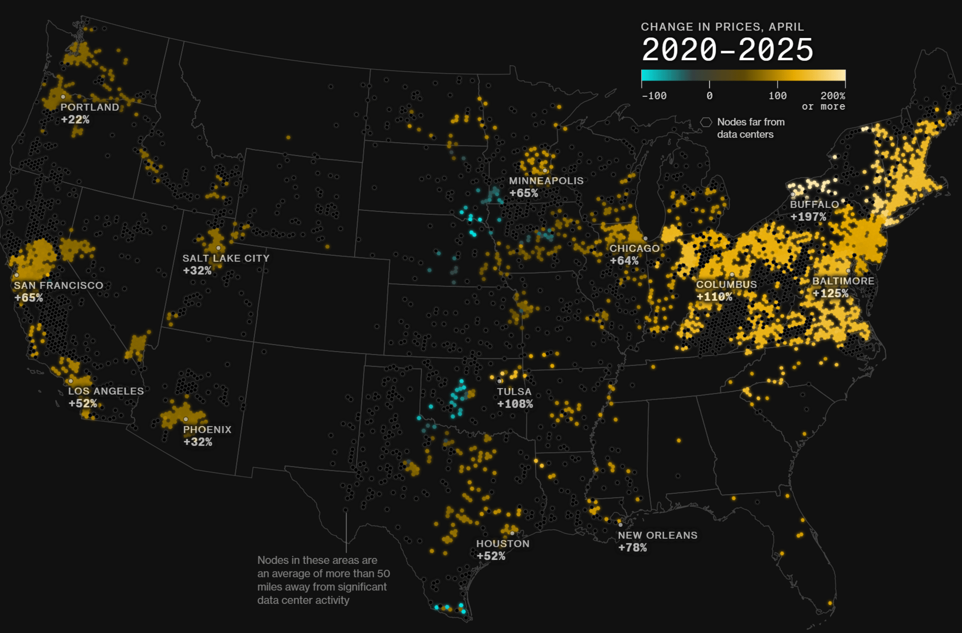 KI Datacenter schaffen erhebliche zusätzliche Nachfrage an Energie. Ein Problem dabei ist, dass diese Energie so schnell fast immer nur mit Hilfe von fossilen Trägern bereitgestellt werden kann. Das andere Problem besteht darin, dass die Kosten für den teuren Strom nicht nur die Investoren der KI-Unternehmen bezahlen, sondern auch ganz normale US-Bürger die Zeche zahlen.