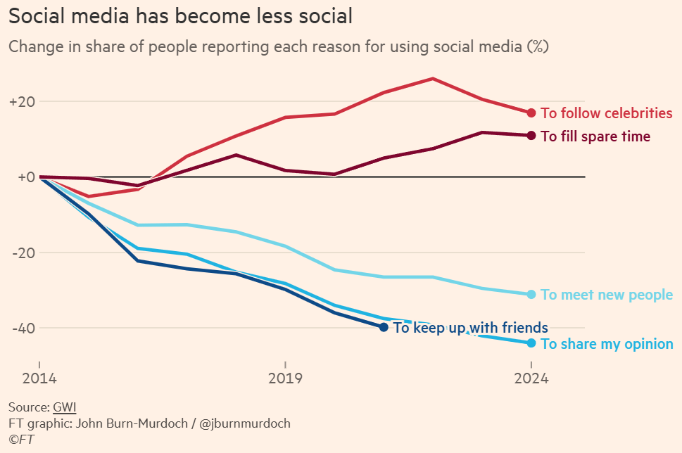 Social Media ist einfach nicht mehr sozial. Seit Jahren optimieren die sozialen Netzwerke nicht mehr auf echte Konversationen und Interaktionen. Der Nordstern der degenerativen Produktentwicklung ist die Nutzungsmaximierung. Es gewinnen die Features und Dark Patterns, die den Nutzern noch mehr Lebenszeit abringen. Immer mehr ist das KI-generierter oder auf Aufmerksamkeit optimierter Video-Content, immer seltener sprechen Menschen noch mit Menschen. Statt dem Schulfreund zum Geburtstag zu gratulieren, schreibt man mit dem AI-Bot oder der südostasiatischen Messaging-Armee von Influencern.