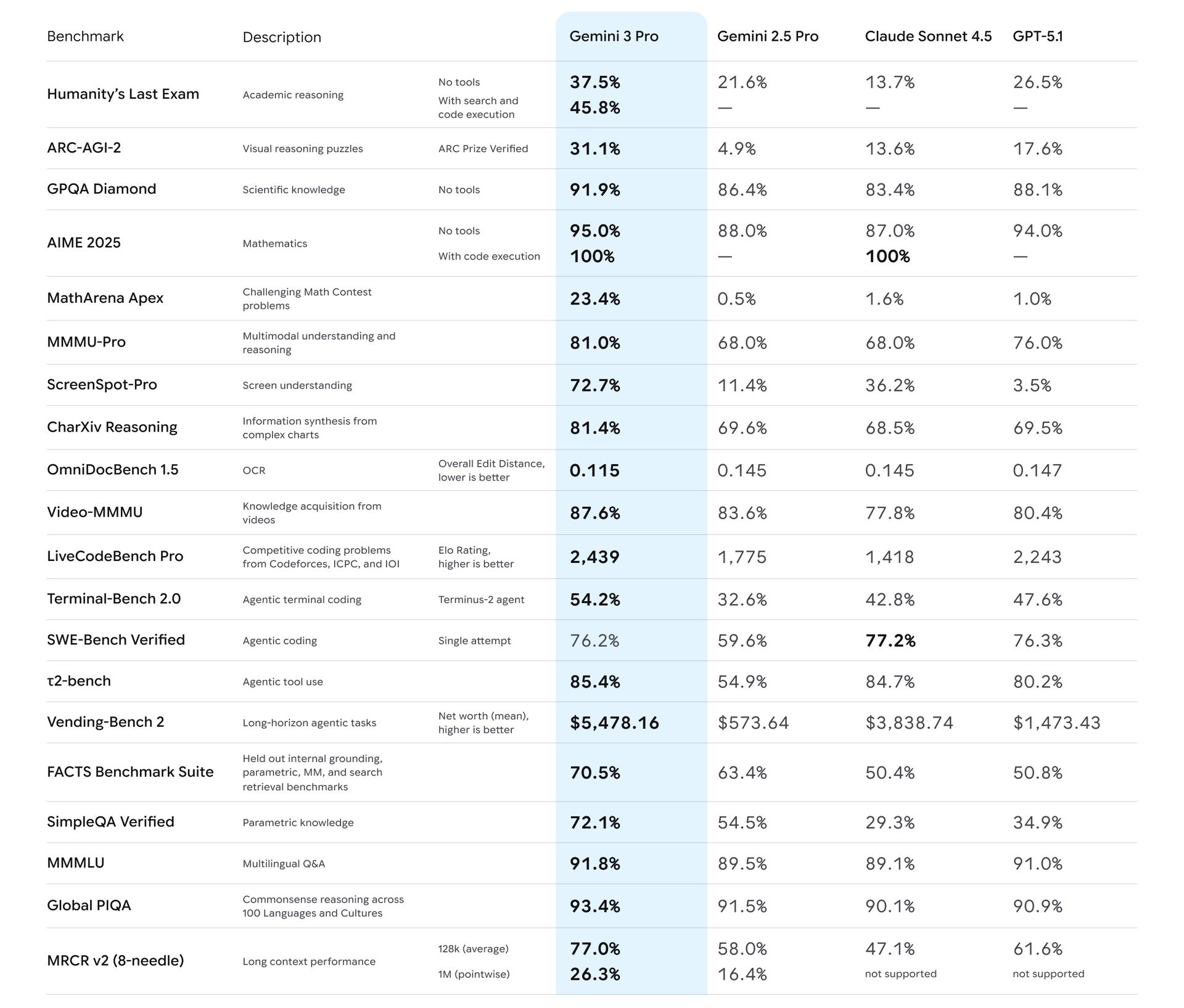 Gemini 3 Pro war scheinbar ein Übernacht-Erfolg für die KI-Forscher von Google. Das neue State-of-the-Art-Modell schlägt andere Modelle nicht nur in vielen Benchmarks: teilweise deklassiert es sie und definiert neue Standards. Stellvertretend könnte man das Ergebnis im “Humanity’s Last Exam” nennen, wo Googles Modell inzwischen rund 46 Prozent der Fragen richtig beantwortet.