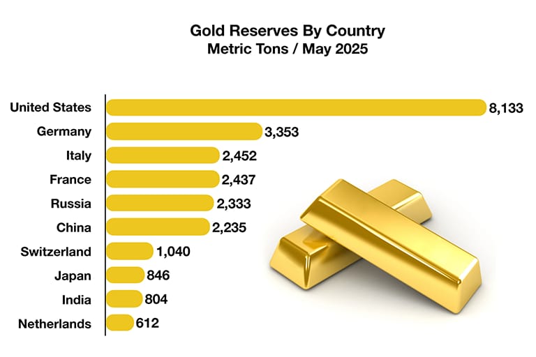 Deutschland hat verhältnismäßig umfangreiche Goldreserven. Sie übersteigen theoretisch sogar die Summe der Staatsverschuldung. Das deutsche Gold lagert unter anderem in London und New York, bis 2016 auch in Paris. Im Falle einer Invasion aus Osten sollte der Staatsschatz schließlich sicher sein. Heute liegt mehr als die Hälfte wieder in Frankfurt.
